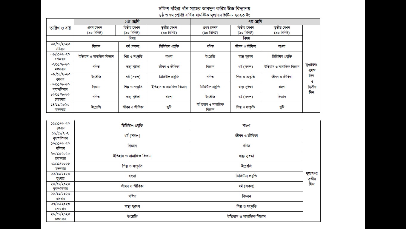 ৬ষ্ঠ শ্রেণির বার্ষিক পরীক্ষা রুটিন-২৩ |